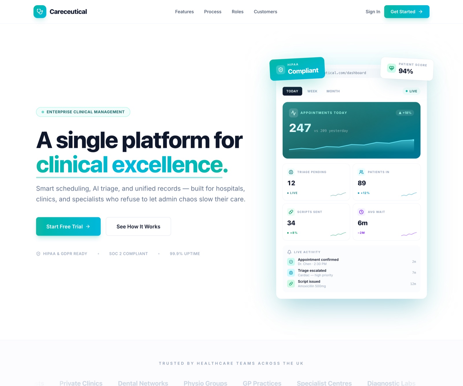 Enterprise clinical management — appointments, triage, patient records, and real-time analytics.
